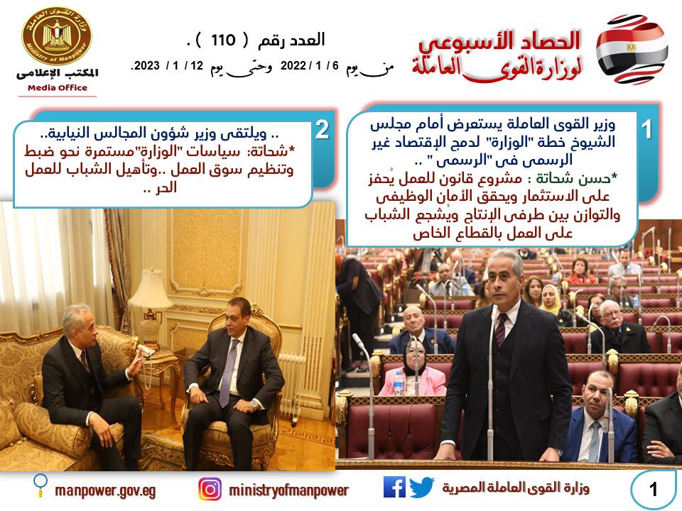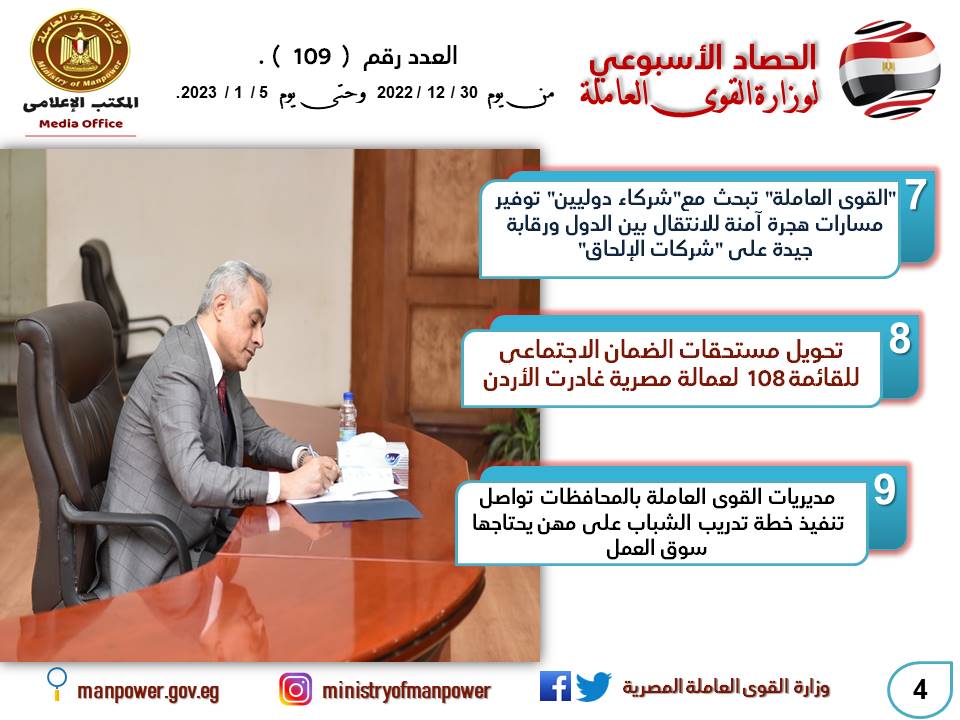 ويشهد هذا الاسبوع ايضا نشاط مكاتب التمثيل العمالي في الخارج في حماية العمالة المصرية حيث تمتلك الوزارة 9 مكاتب خارجية ترعى ما يقرب من 5 ملايين مصري في نطاق عملها.