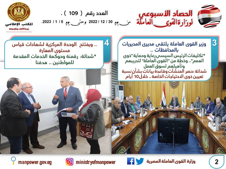 وجه وزير القوى العاملة حسن شحاتة مديري مديريات القوى العاملة المنتشرة في كافة المحافظات، سرعة الانتهاء من الحصر،وتوفير البيانات والمعلومات الخاصة بأعداد المنشآت داخل كل محافظة،ونسبة تعيين ذوي الهمم بها،وكذلك الاعداد المتبقية حتى تستوفي تلك المنشآت نسبة ال5٪،المطلوبة طبقا للقانون رقم 10 لسنة 2018 والخاص بنسبة تعيين ذوي الاحتياجات الخاصة،واوضح الوزير أن هذه المعلومات مطلوبة من المديريات،وخلال 10 ايام .