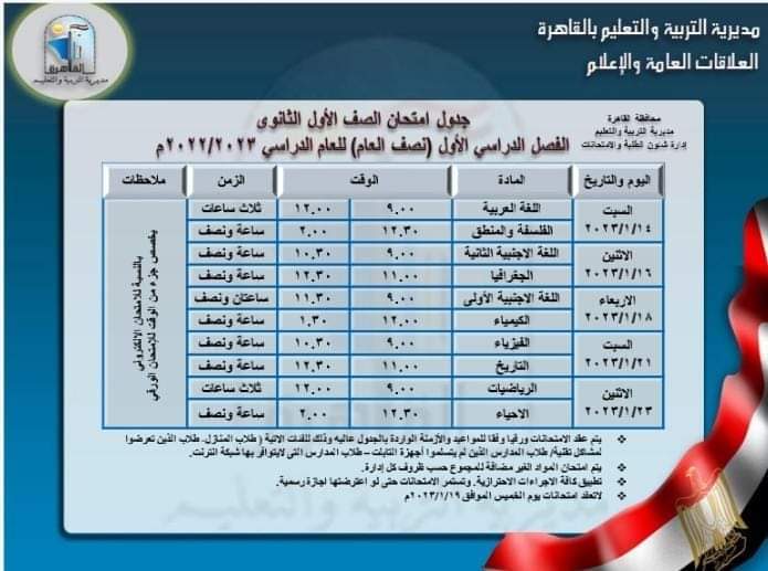 وأعلنت مديرية التربية والتعليم بمحافظة القاهرة، جدول امتحانات الصف الأول الثانوي للفصل الدراسي الأول للعام الدراسي الحالي 2022 /2023.