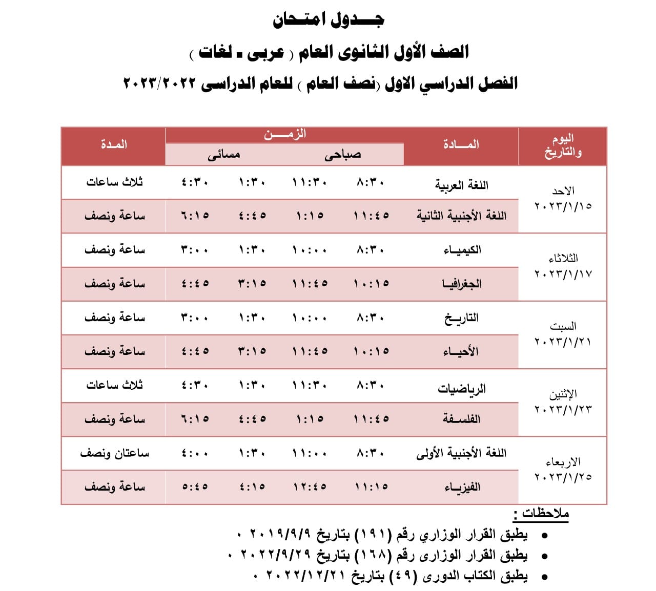 جدول امتحانات الصف الثاني الثانوي للفصل الدراسي الأول بالجيزة