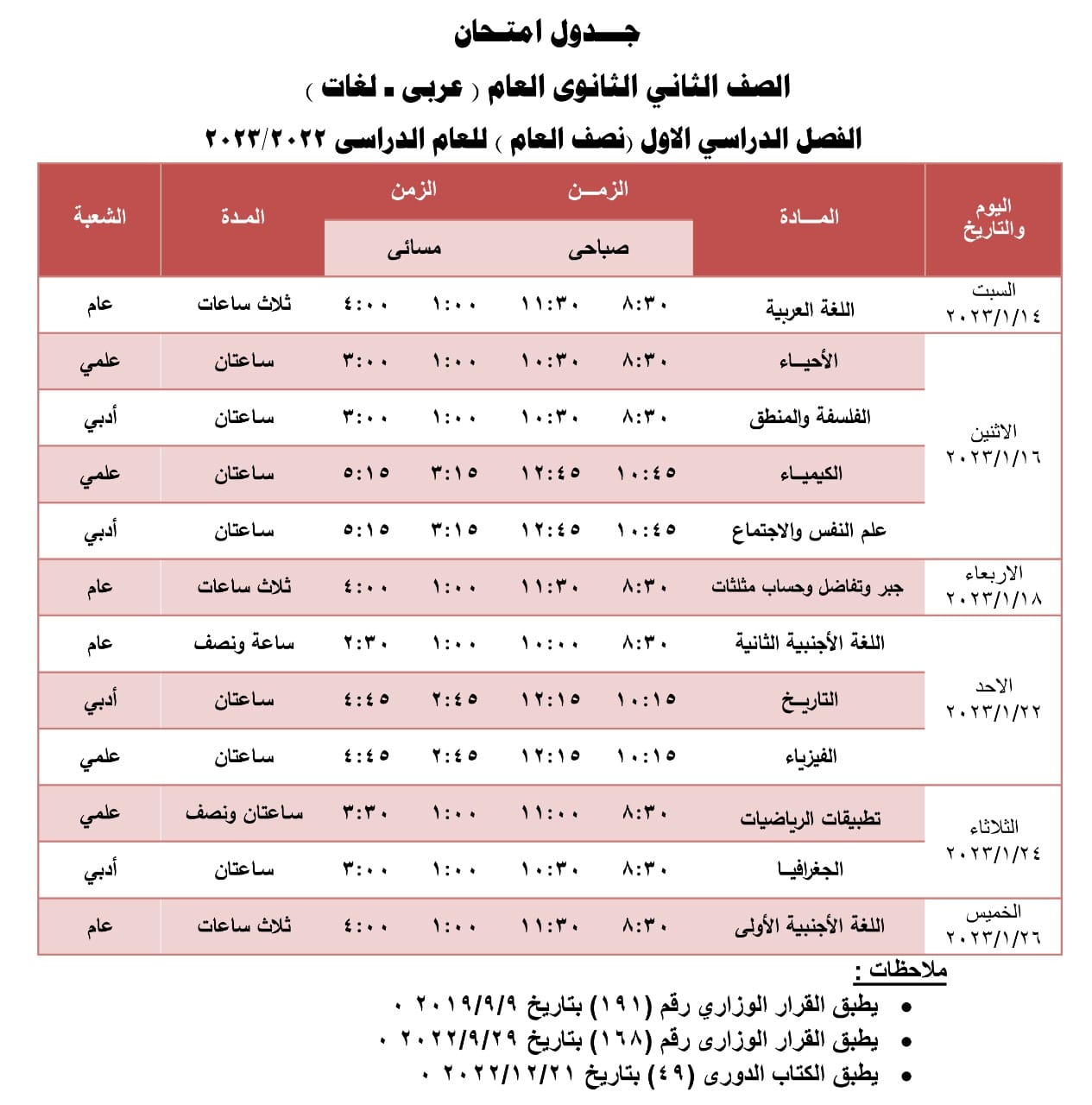 -يعقد يوم الأربعاء الموافق 25 يناير امتحان التاريخ لطلاب الشعبة الأدبية وامتحان الأحياء لطلاب الشعبة العلمية.