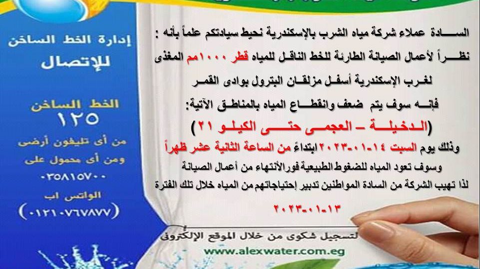 أعلنت محافظة الإسكندرية وشركة مياه الشرب قطع وضعف المياه بحي العجمي كاملًا بدءًا من الساعة ٢ ظهر اليوم السبت١٤ يناير.