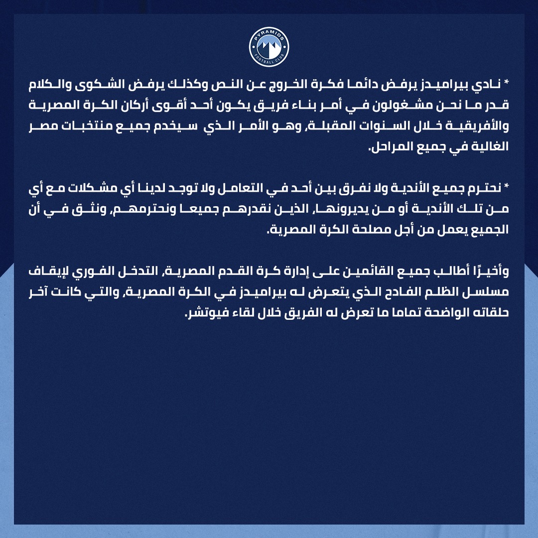 أصدرت وزارة الشباب والرياضة بيانا رسميا للرد على بيان نادي بيراميدز، والذي هدد فيه بالانسحاب من المشاركة بالبطولات المصرية ومن النادي أيضا، اعتراضا على الظلم الذي يتعرض له الفريق خلال الموسم الحالي.