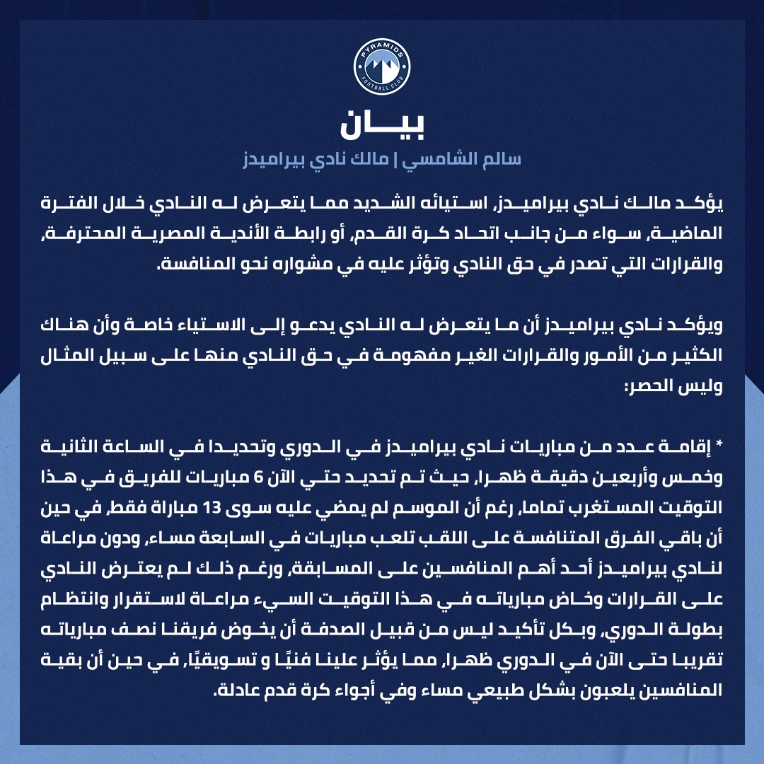 وأتى بيان الشباب والرياضة كالتالي: فى ضوء البيان الذى أصدره رئيس نادى بيراميدز سالم الشمسي...أكد الدكتور أشرف صبحي وزير الشباب والرياضة أن الوزارة حريصة على توفير وتهيئة المناخ والأجواء المناسبة للمنظومة الرياضية المصرية لتكون جاذبة للاستثمارات الرياضية العربية والأجنبية.