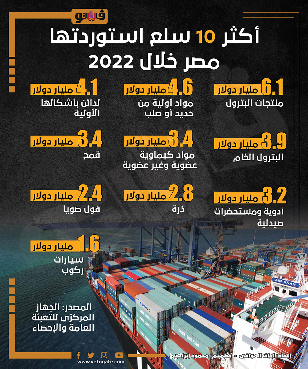 أكثر 10 سلع استوردتها مصر خلال 2022 (إنفوجراف) السبت 14/يناير/2023 - 01:29 م 1/14/2023 1:29:27 PM جانب من اللقاء،فيتو آيات الموافى شارك طباعة 18 حجم الخط شارك طباعة الجهاز المركزى للتعبئة العامة والإحصاء منتجات البترول مواد كيماوية