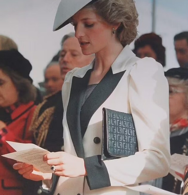 وظهرت ديانا بسترة باللونين الأبيض والأسود ومن أسفلها بلوزة مخططة، في زي مشابه لزي البحرية البريطانية، بالإضافة لذلك، ارتدت ديانا قبعة مطابقة وحملت حقيبة كلاتش بسيطة.