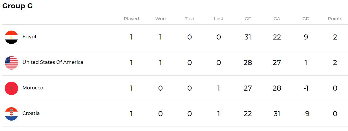 ويحتل منتخب مصر حاليا المركز الأول في ترتيب المجموعة السابعة بنقطتين، ويحل في المركز الثاني منتخب أمريكا بنفس الرصيد من النقاط، ثم كرواتيا والمغرب بدون نقاط.