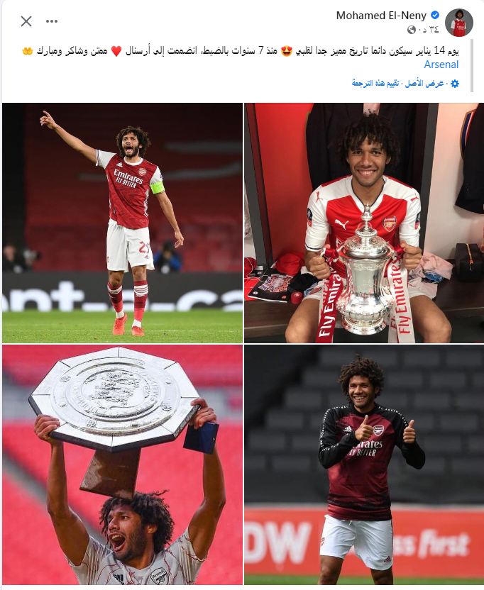 وكتب محمد النني عبر حسابه الرسمي على موقع التواصل الاجتماعي فيسبوك: يوم 14 يناير سيكون دائما تاريخ مميز جدا لقلبي، منذ 7 سنوات بالضبط، انضممت إلى أرسنال، ممتن وشاكر ومبارك.
