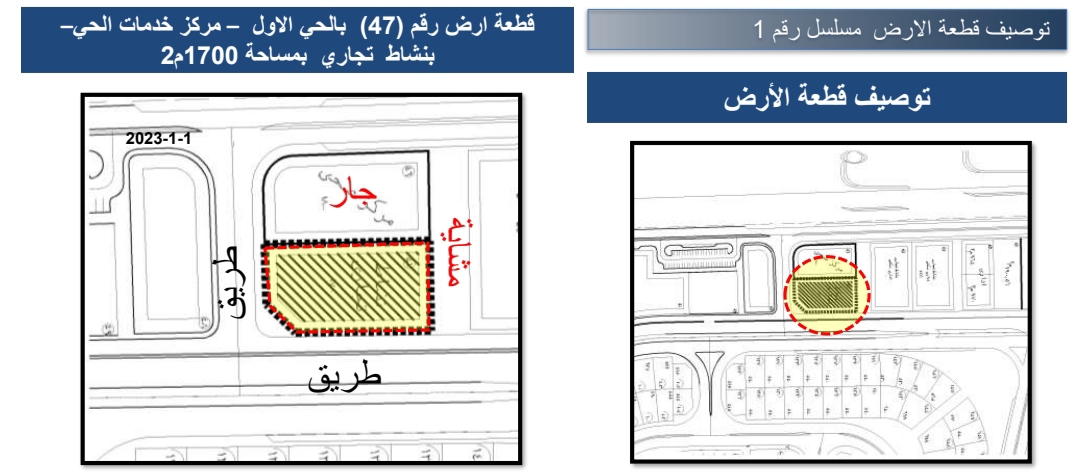 قطعة أرض رقم (47) بالحي الأول بمركز خدمات الحي بنشاط تجاري بمساحة 1700م² وسعرها التقديري 4965 جنيها مصريا للمتر².