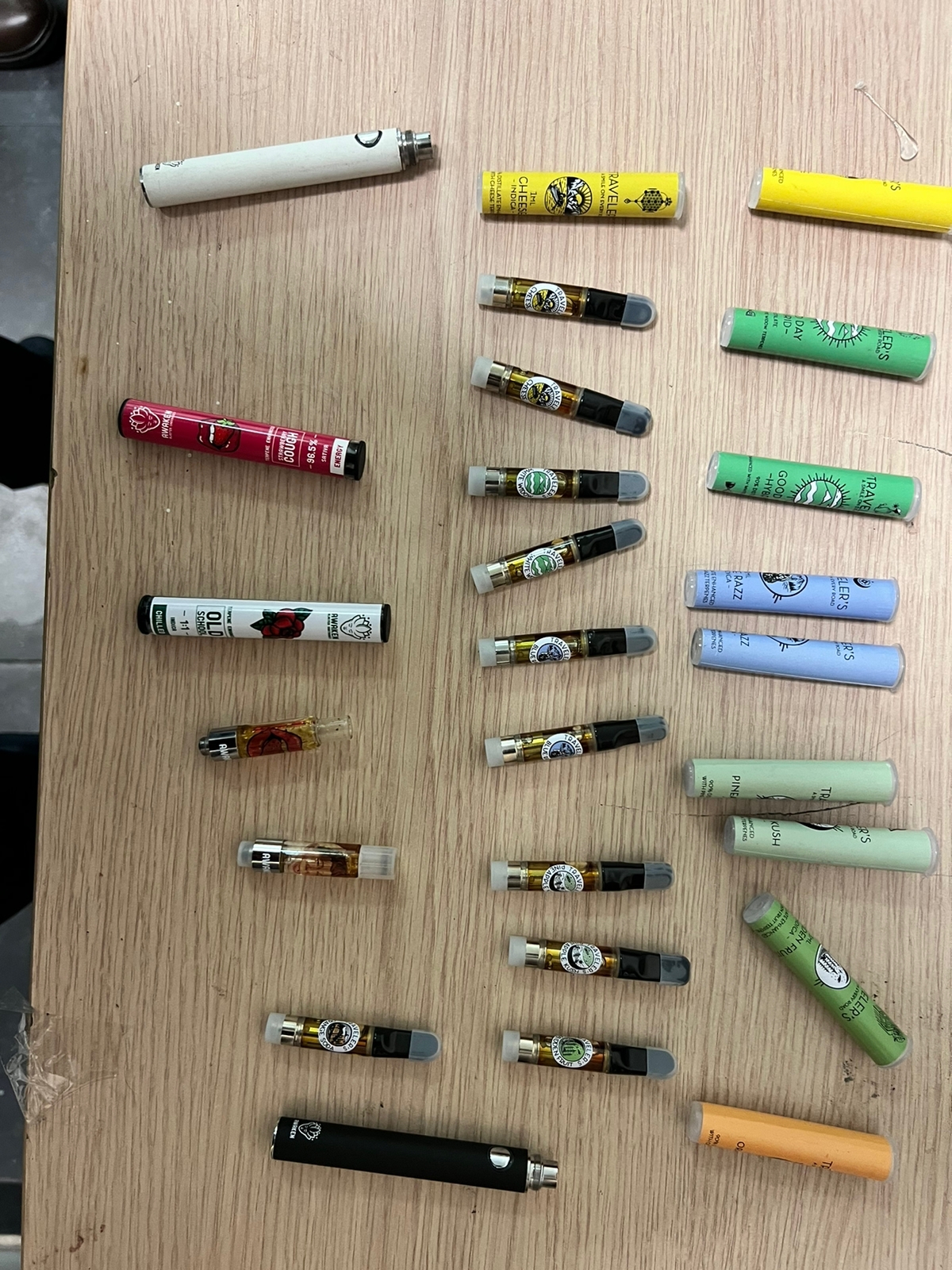 بلغ عدد المضبوطات ١٥ عبوة متنوعة عبارة عن: ١٣ عبوة بلاستيكية بكل عبوة "تانكات" تحتوي علي زيت الماريجوانا المخدر و٢ جهاز يستخدمان في تسخين الـ "تانكات".