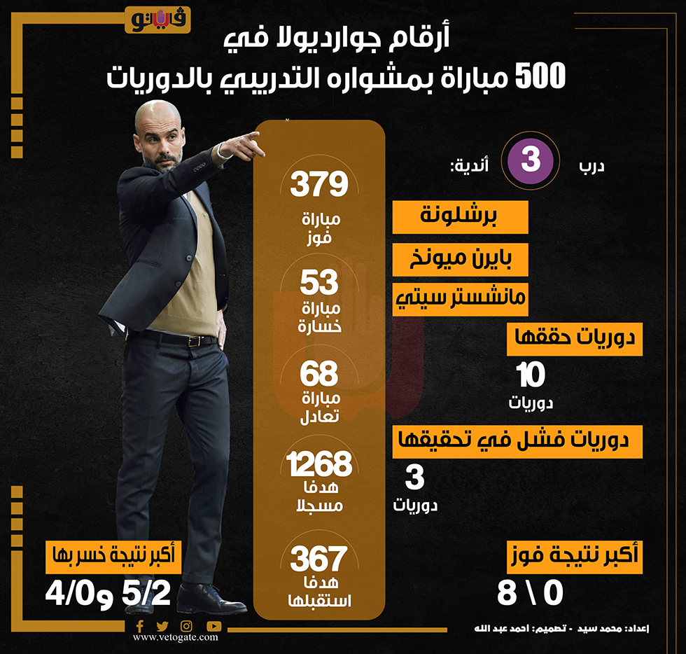 أرقام جوارديولا في 500 مباراة بمشواره التدريبي بالدوريات (إنفوجراف) الأحد 15/يناير/2023 - 01:47 م 1/15/2023 1:47:26 PM جوارديولا، فيتو محمد سيد شارك طباعة 18 حجم الخط شارك طباعة جوارديولا مانشستر سيتي بايرن ميونخ برشلونة