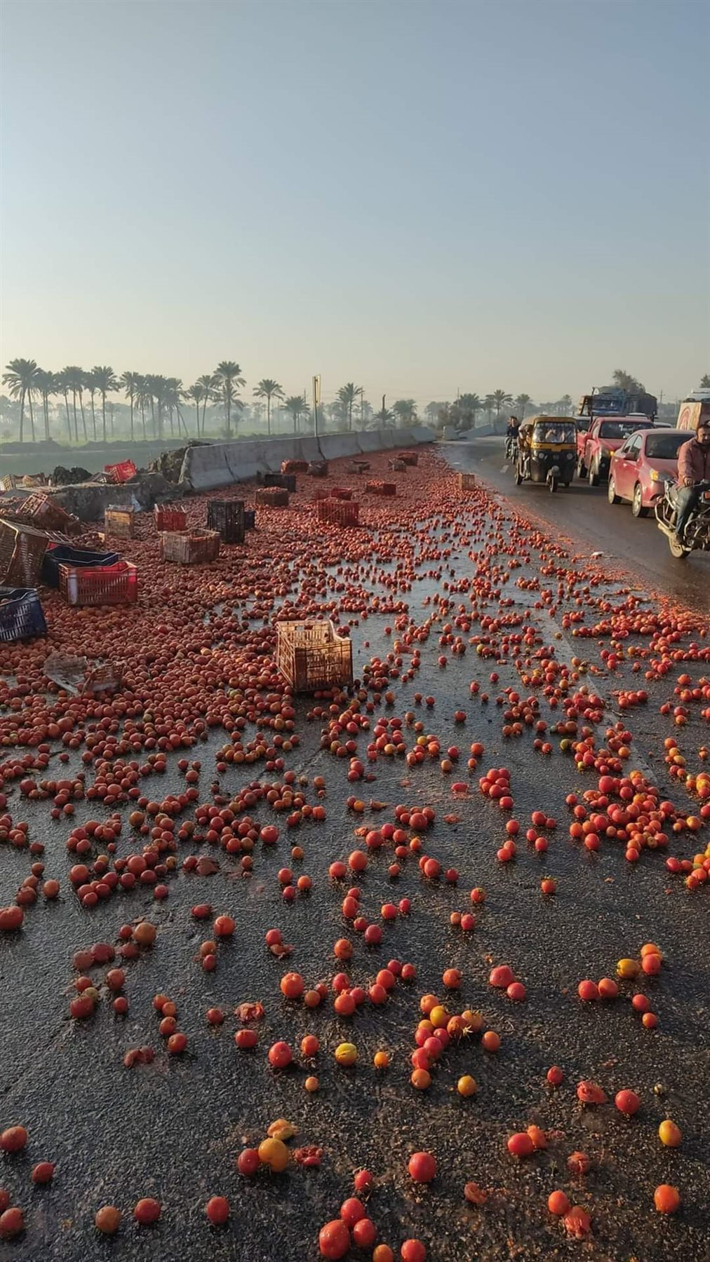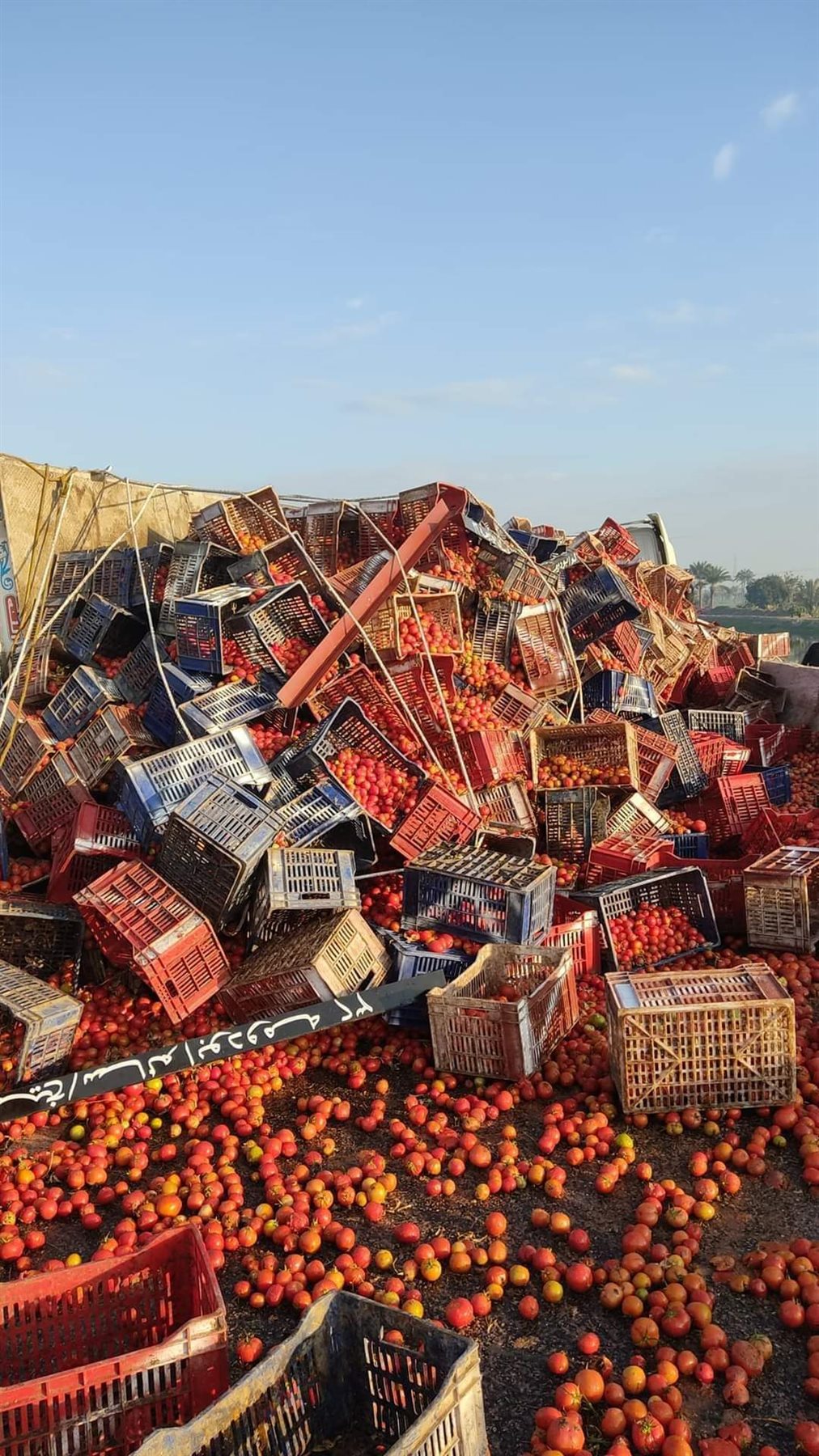 وعلى الفور، انتقلت قوة أمنية لمكان الحادث على طريق الموت طريق رافد جمصة، وتبين أن سيارة نقل محملة بالطماطم من الصعيد انقلبت على الطريق.