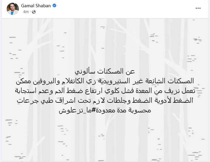 وكتب الدكتور جمال شعبان عن المسكنات الشائعة محذرًا في تدوينة عبر الفيس بوك "عن المسكنات سألوني.. المسكنات الشائعة غير الستيرويدية زي الكاتفلام والبروفين ممكن تعمل نزيف من المعدة فشل كلوي ارتفاع ضغط الدم وعدم استجابة الضغط لأدوية الضغط وجلطات لازم تحت اشراف طبي جرعات محسوبة مدة معدودة#ما_تزعلوش".