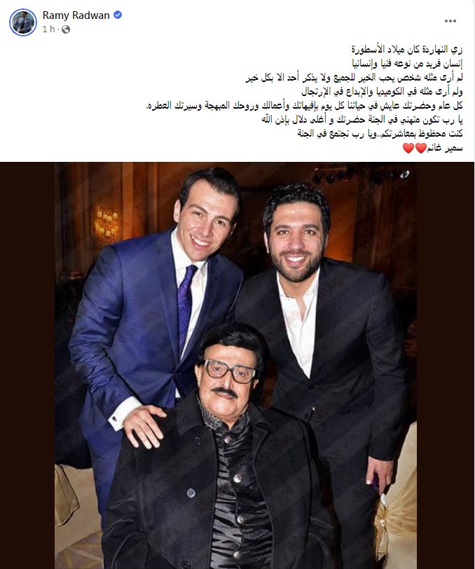ونشر رامي رضوان صورة رفقة سمير غانم والفنان حسن الرداد، وعلق عليها قائلا: "زي النهاردة كان ميلاد الأسطورة، إنسان فريد من نوعه فنيا وإنسانيا، لم أرى مثله شخص يحب الخير للجميع، ولا يذكر أحدا إلا بكل خير ولم أر مثله في الكوميديا والإبداع في الارتجال".