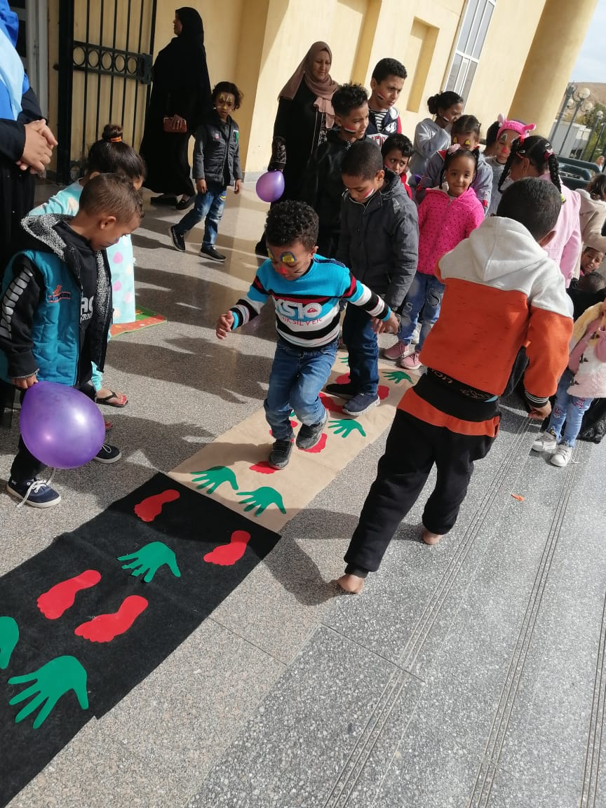 حيث تم تنظيم ورش عمل لعمل مخدات زينة من الجوخ الملون، تلوين مجسمات من الأسمنت، الرسم الحر، التلوين الجماعي والطباعة، بالإضافة إلى الرسم على الوجه وتوزيع الهدايا والحلوى على الأطفال المتواجدين مع أهاليهم بالمستشفى.