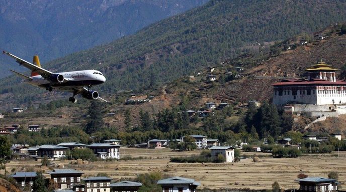 مطار مملكة بوتان: هو الوحيد في البلاد، ولا يهبط به إلى الطيارون الذين يوصفون بـ"المهرة" والأكثر تدريبا، ويكون الهبوط مقتصرا على الأوقات التي تكون فيها الرؤية واضحة بشكل كاف.