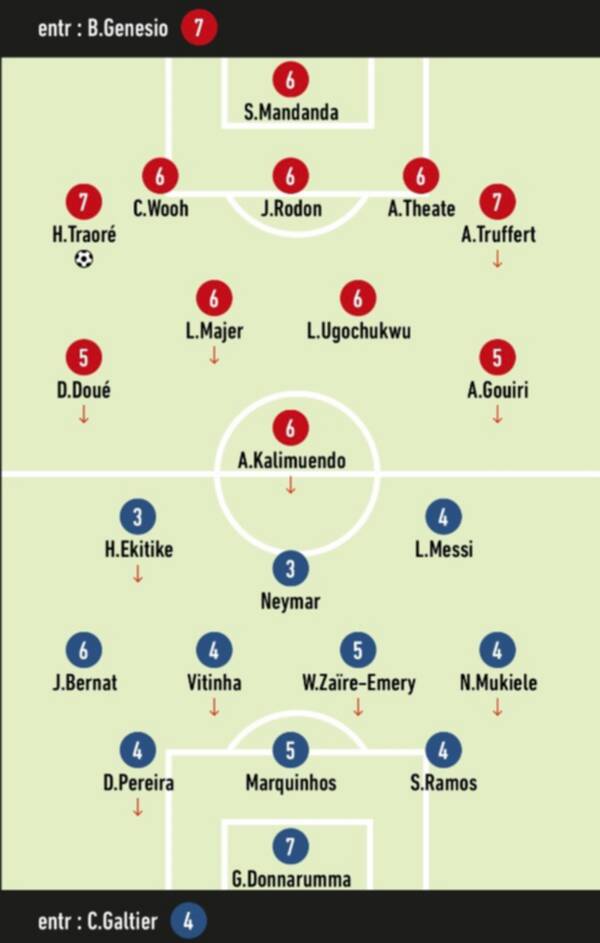 لم ينتبه باريس سان جيرمان لخطورة الثلاثي أمين جويري وكاليمويندو ولوفرو ماير، حتى استقبل الهدف الأول بقدم هاماري تراوري بعد تمريرة من تروفيرت، الذي تلاعب بأشرف حكيمي.