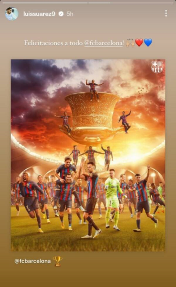 ونشر سواريز على حسابه بشبكة إنستجرام، تصميما لانتصار برشلونة في السوبر الإسباني، وكتب عليه: "تهانينا للجميع في البارسا".