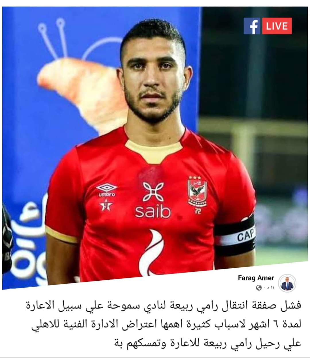 وقال فرج عامر عبر صفحته في فيسبوك: فشل انتقال رامي ربيعة مدافع الأهلي إلي نادي سموحة السكندري لمدة 6 شهور على سبيل الإعارة بسبب تمسك الإدارة الفنية بالأهلي باللاعب.