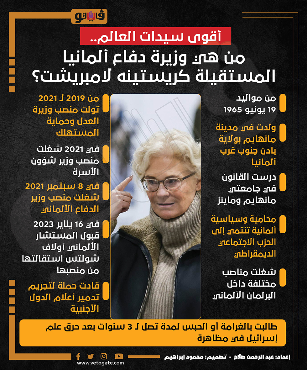 أقوى سيدات العالم.. من هي وزيرة دفاع ألمانيا المستقيلة كريستينه لامبريشت؟ (انفوجراف) الإثنين 16/يناير/2023 - 08:48 م 1/16/2023 8:48:31 PM كريستينه لامبريشت، فيتو عبدالرحمن صلاح شارك طباعة 18 حجم الخط شارك طباعة كريستيه لامبريشت وزيرة دفاع ألمانيا الجيش الألماني ألمانيا أقوي سيدات العالم أقوي سيدة بالعالم اخبار العالم