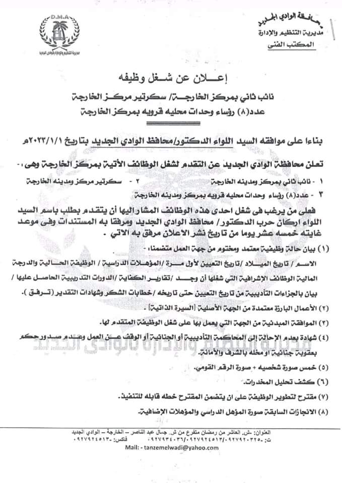 أعلنت محافظة الوادي الجديد حاجتها لوظائف شاغرة بمركز الخارجة بناءً على موافقة اللواء محمد الزملوط.