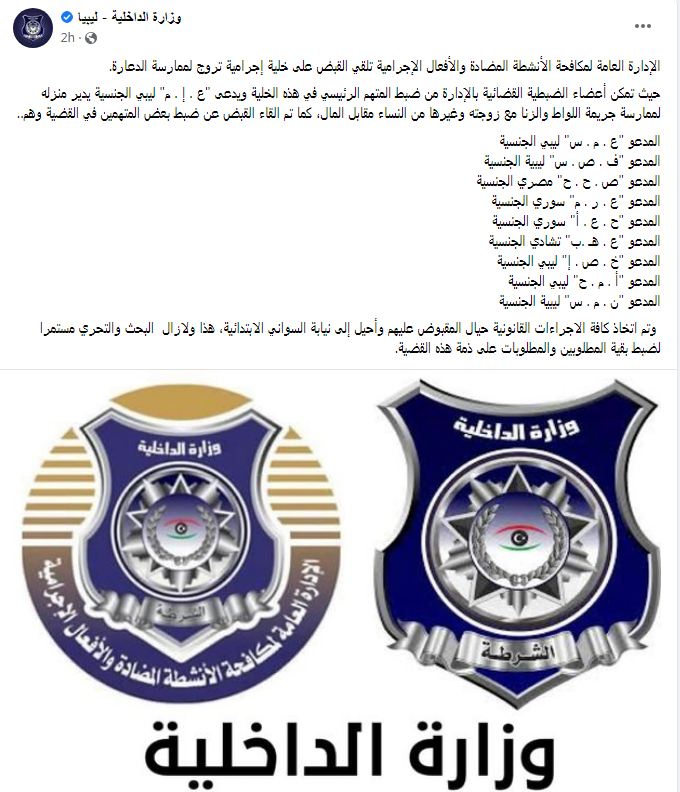 ليبيا، أصدرت الإدارة العامة لمكافحة الأفعال الإجرامية بوزارة الداخلية الليبية بيانا تكشف من خلاله القبض على خلية إجرامية تروج لممارسة الدعارة.