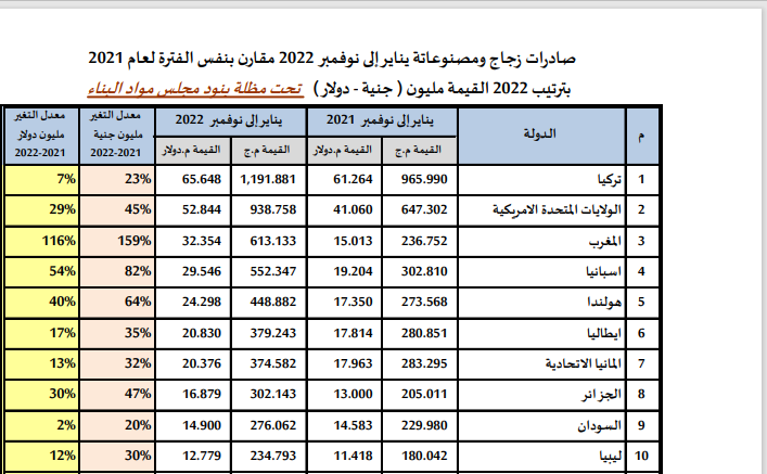 1- احتلت تركيا في المركز الأول بقائمة أكبر الدول المستوردة للزجاج ومصنوعاته من مصر بقيمة 65,648 مليون دولار خلال أول 11 شهر من 2022 مقابل 61,264 مليون دولار بنسبة نمو 7%.