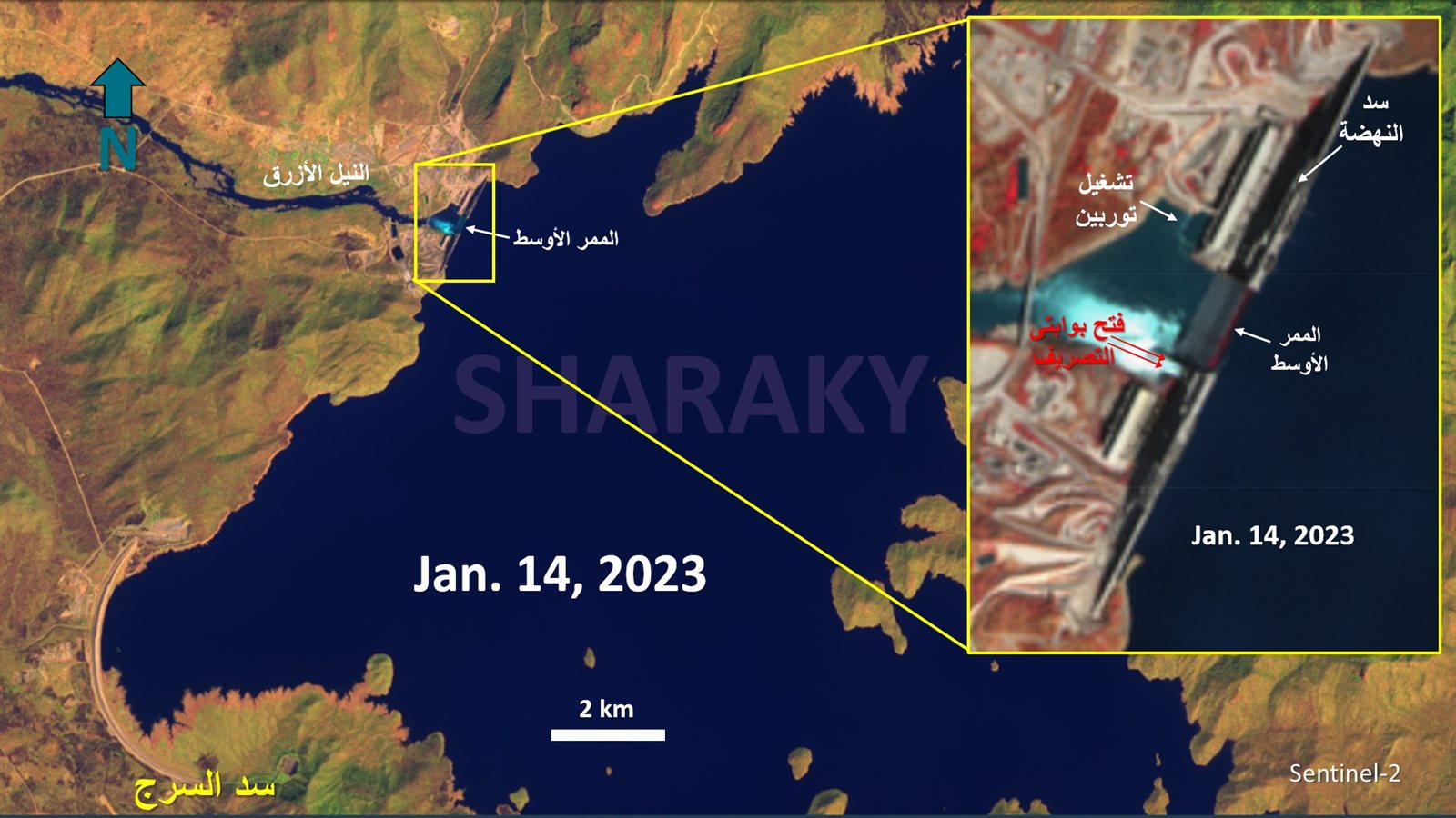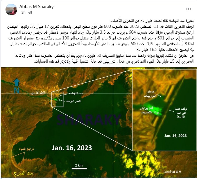 وفي تدوينة سابقة، تحدث عباس شراقي عن توقف المياه أعلى الممر الأوسط وتصريف المياه دون استفادة فقال: "قامت إثيوبيا الاحد الماضى 8 يناير 2023 بفتح بوابتى التصريف لتمرير المياه، التى تتدفق أعلى الممر الأوسط وكميتها حوالى 30 مليون متر مكعب يوميًا بعد فشل التوربينين فى إمرار هذه الكمية البسيطة رغم ان قدرتهما 50 مليون متر مكعب يوميًا لكل منهما"