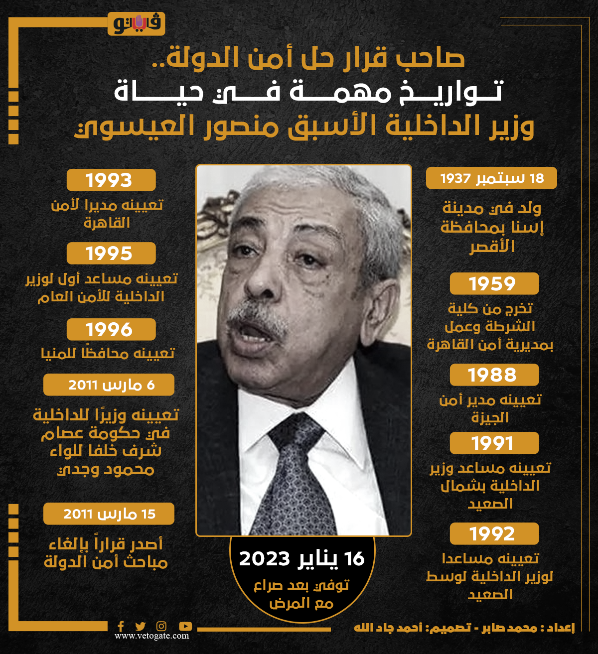 صاحب قرار حل أمن الدولة.. تواريخ مهمة في حياة وزير الداخلية الأسبق منصور العيسوي (انفوجراف) الثلاثاء 17/يناير/2023 - 01:51 م 1/17/2023 1:51:52 PM اللواء منصور العيسوى محمد صابر شارك طباعة 18 حجم الخط شارك طباعة ثورة 25 يناير مديرية أمن القاهرة وفاة منصور العيسوى من هو منصور العيسوى وفاة وزير الداخلية الأسبق وفاة اللواء منصور العيسوى