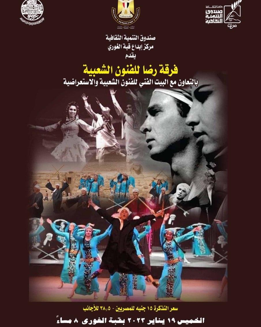 يستضيف مركز إبداع قبة الغورى بشارع الأزهر، والتابع لقطاع صندوق التنمية الثقافية في تمام الثامنة من مساء الخميس المقبل الموافق 19 يناير الجاري، حفلًا جديدًا لفرقة رضا للفنون الشعبية التابعة للبيت الفني للفنون الشعبية والاستعراضية.