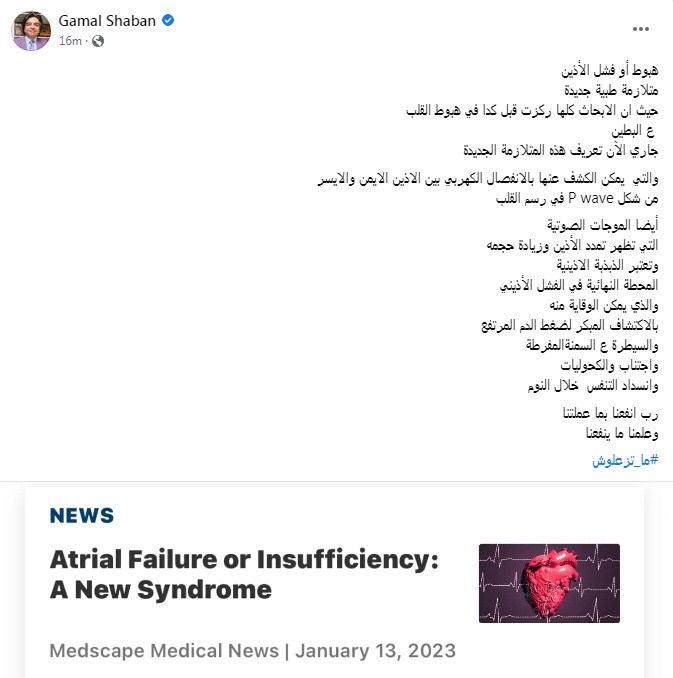 وقال الدكتور جمال شعبان عن المتلازمة الطبية فشل الاذين في القلب: "هبوط أو فشل الأذين، متلازمة طبية جديدة حيث ان الابحاث كلها ركزت قبل كدا في هبوط القلب على البطين".