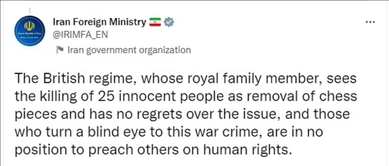 وقالت الخارجية الإيرانية في تغريداتها إن بريطانيا ليست في موقع يسمح لها بالوعظ، مستشهده باعترافات الأمير هاري في كتابه ""spare عن مشاركته في حرب أفغانستان وقيامه بقتل 25 عنصر من طالبان دون أن يشعر بالندم على الأرواح البريئة، مؤكدة أن لندن سمحت بارتكاب جريمة حرب.