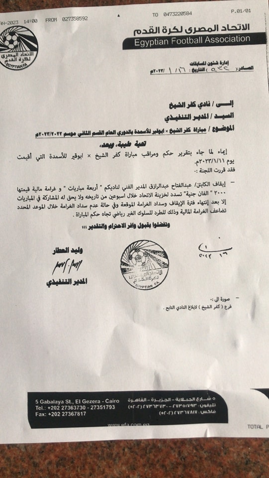 وأشار بيان خطاب اتحاد الكرة انه لن يتم السماح للمدرب بالمشاركة في المباريات إلا بعد سداد الغرامة , مؤكدا أنه في حالة عدم سداد الغرامة خلال اسبوعين من تاريخه يتم مضاعفة الغرامة.