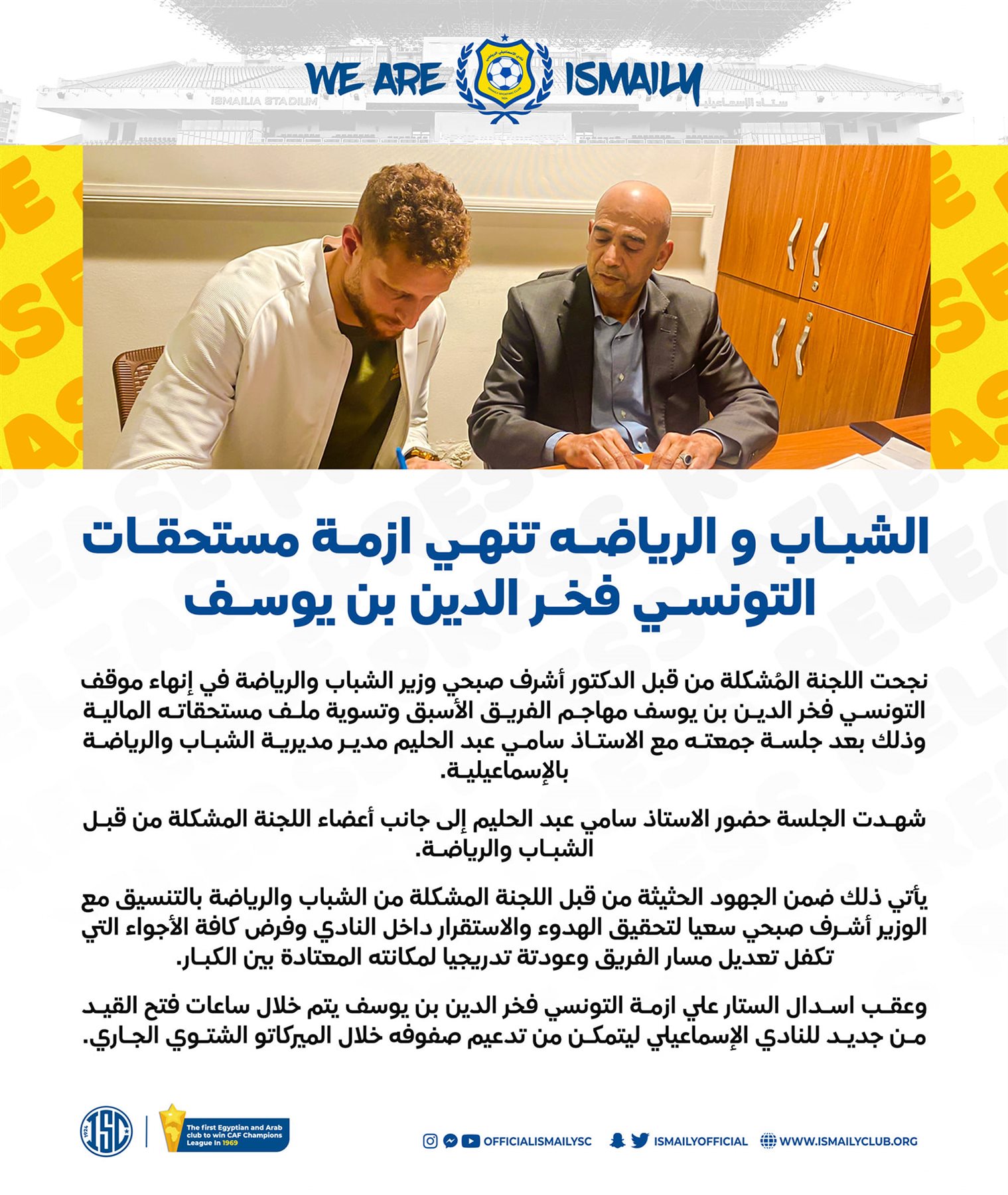 الاسماعيلي، نجحت اللجنة المشكلة من قبل الدكتور أشرف صبحي وزير الشباب والرياضة في إنهاء موقف التونسي فخر الدين بن يوسف مهاجم الفريق الأسبق وتسوية ملف مستحقاته المالية، وذلك بعد جلسة جمعته مع سامي عبد الحليم مدير مديرية الشباب والرياضة بالإسماعيلية.