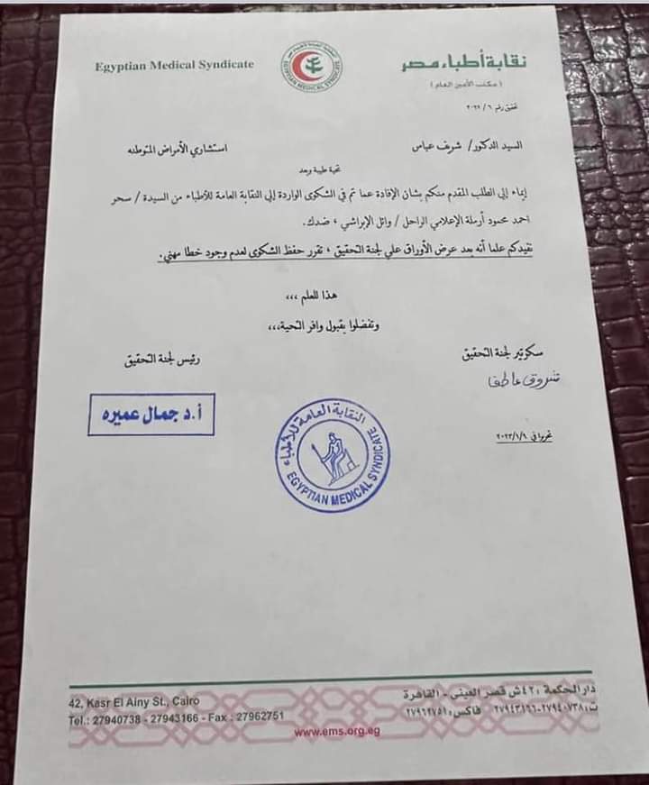 كان الدكتور جمال عميرة رئيس لجنة التحقيق بنقابة الأطباء قد أصدر خطابًا إلى الدكتور شريف عباس استشاري الأمراض المتوطنة بشأن ما وصلت اليه نقابة الأطباء في التحقيقات في الشكاوي الواردة الي نقابة الأطباء من السيدة سحر ارملة الإعلامي وائل الإبراشي ضد الدكتور شريف عباس.