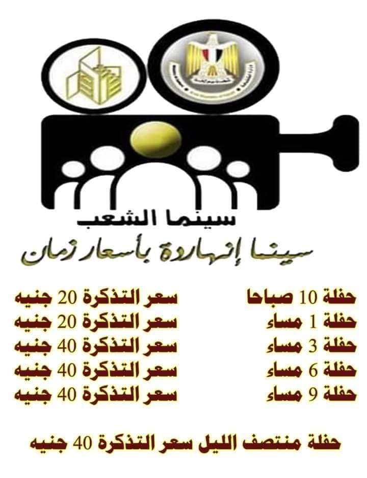 و سعر التذكرة فى العطلات الرسمية لمشروع سينما الشعب يومي الجمعة والسبت 40 جنيهًا وباقى الايام اول حفلتين 20 جنيهًا فقط.