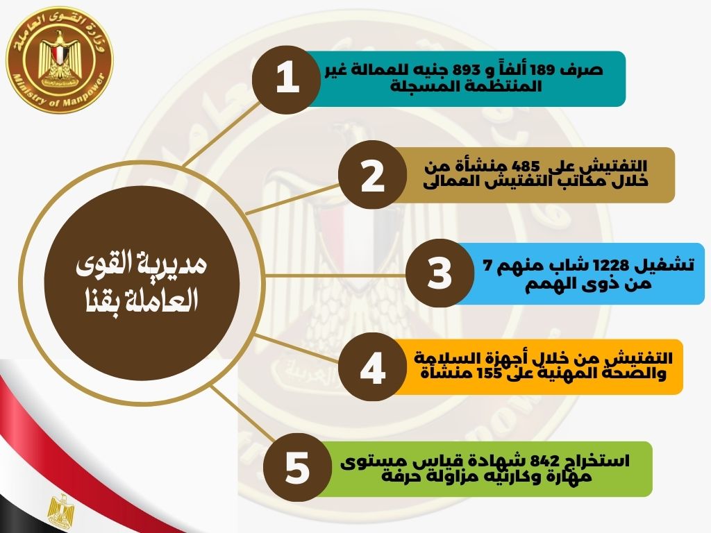 والتقرير الثالث قال فيه أحمد جابر مدير مديرية القوى العاملة بقنا، انه تم تشغيل 1228 شاب منهم 7 ذوى الهمم، واستخراج 842 شهادة قياس مستوى مهارة وكارنيه مزاولة حرفة، والتفتيش على 485 منشأة عماليًا واسفر عن تحرير 34 محضرًا، وعمل 2 ندوة للتوعية، والتفتيش على 155 منشأة فى مجال السلامة والصحة المهنية واسفر عن تحرير 95 محضرًا للمنشآت المخالفة، وصرف 189 ألفًا و893 جنيه للعمالة غير المنتظمة المسجلة بالمديرية.
