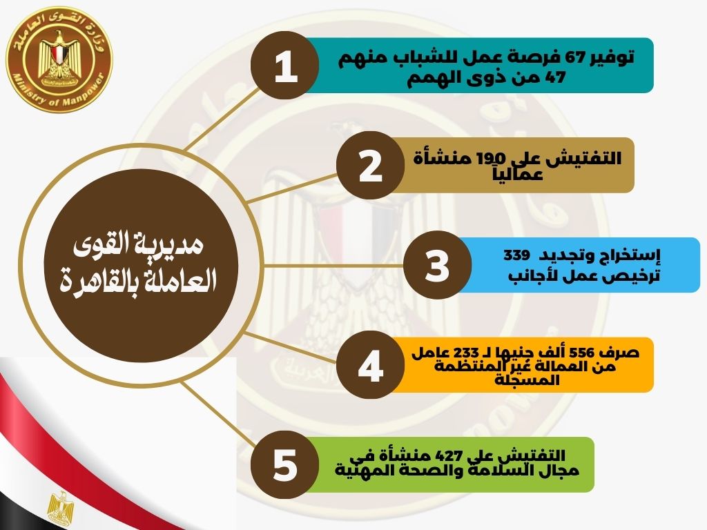 وجاء في بيان صحفى للوزارة، اليوم الاربعاء، أن التقرير الاول الذى تلقته الوزارة من أحمد نظمى مدير مديرية القوى العاملة بالقاهرة بشأن نشاطها خلال الشهر، أوضح فيه ان المديرية قامت بصرف 556 ألف جنيها لـ 233 عامل من العمالة غير المنتظمة المسجلة بقاعدة بياناتها، واستخرجت وجددت 339 ترخيص عمل لأجانب، كما قامت بالتفتيش الدورى من خلال أجهزة السلامة والصحة المهنية على 427 منشأة، و190 منشأة من خلال مكاتب التفتيش العمالى، كما استخرجت 2621 شهادة قياس مستوي مهارة وكارنيه مزاولة حرفة، فضلًا عن توفير 67 فرصة عمل للشباب منهم 47 من ذوى الهمم من ابناء المحافظة.