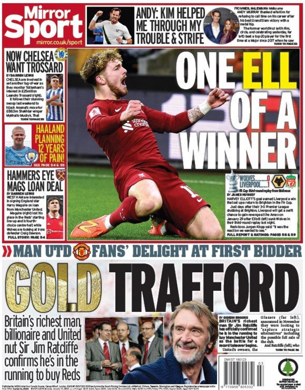 أبرزت الصحف الإنجليزية الصادرة صباح اليوم الأربعاء، فوز ليفربول على وولفرهامبتون 0/1 في كأس الاتحاد الإنجليزي، واهتمام الملياردير البريطاني جيم راتكليف بشراء نادي مانشستر يونايتد.