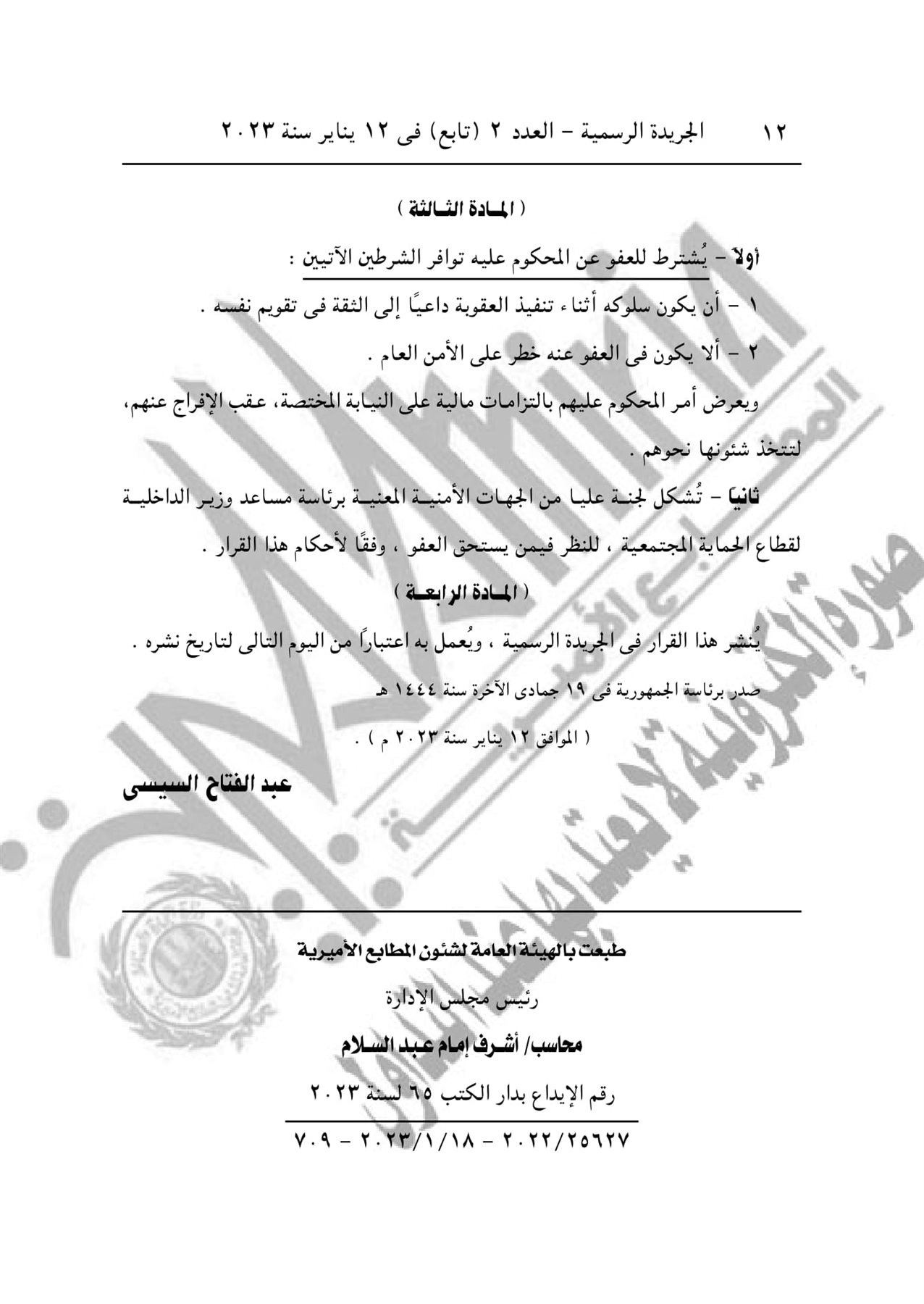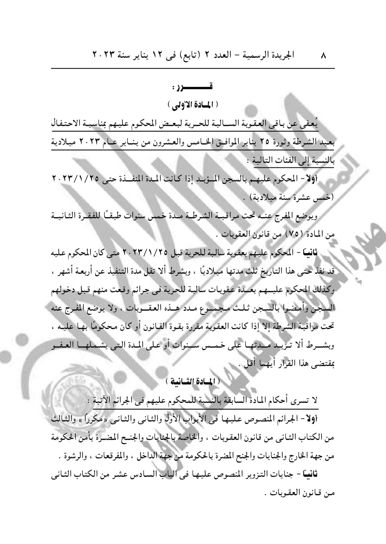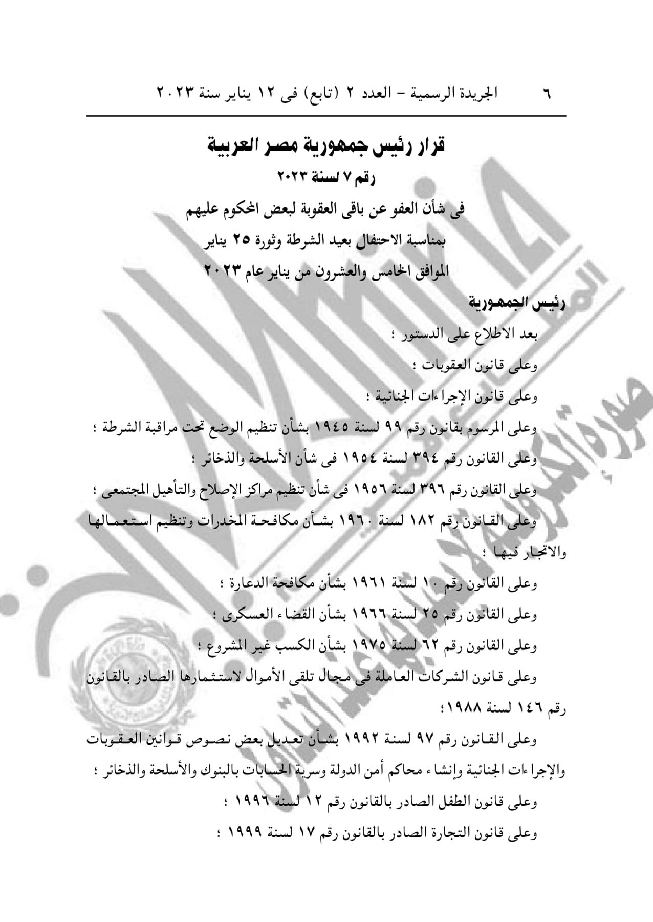 أصدر الرئيس عبد الفتاح السيسى، القرار رقم 7 لسنة 2023 بشأن العفو عن باقي العقوبة لبعض المحكوم عليهم بمناسبة الاحتفال بعيد الشرطة وثورة 25 يناير.