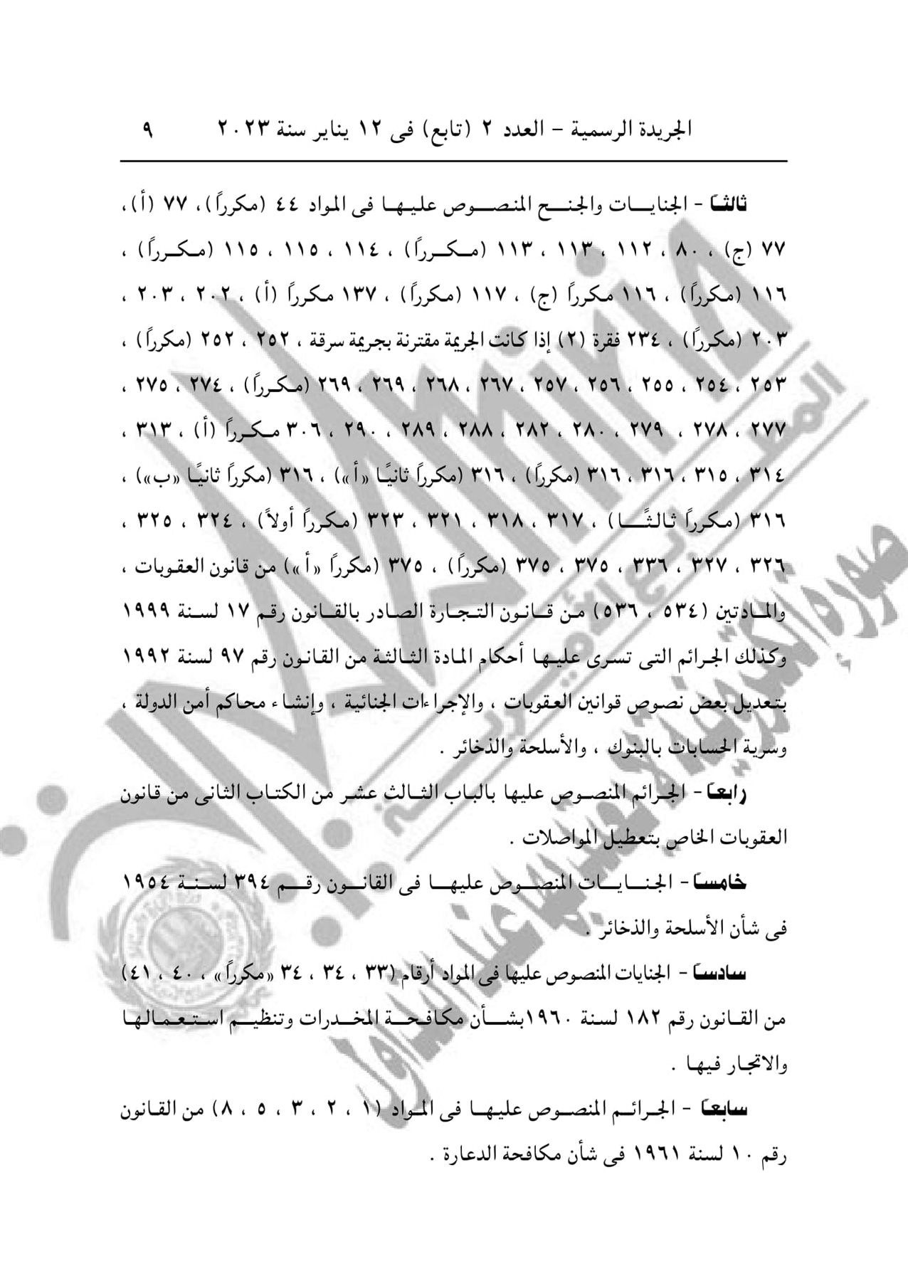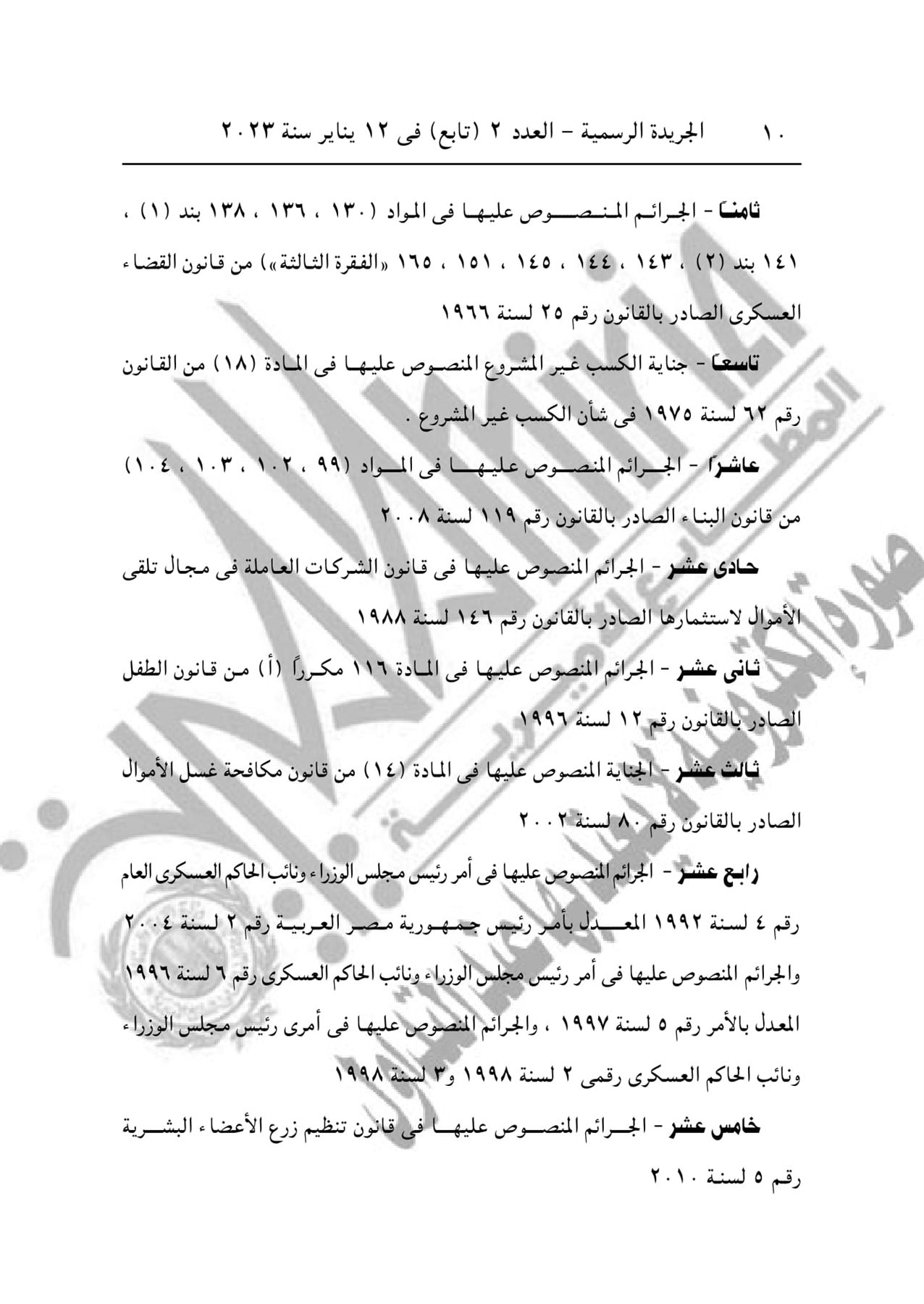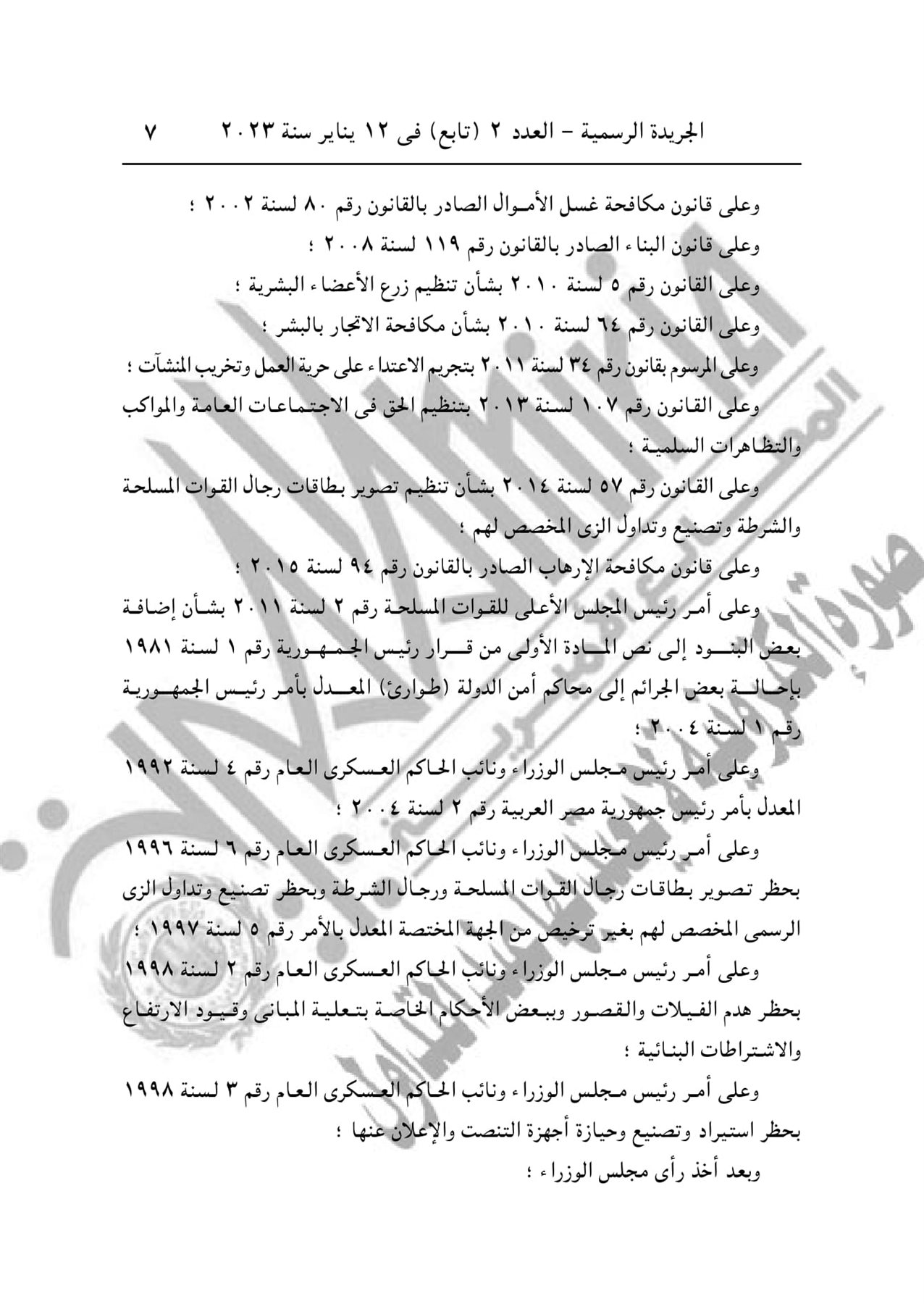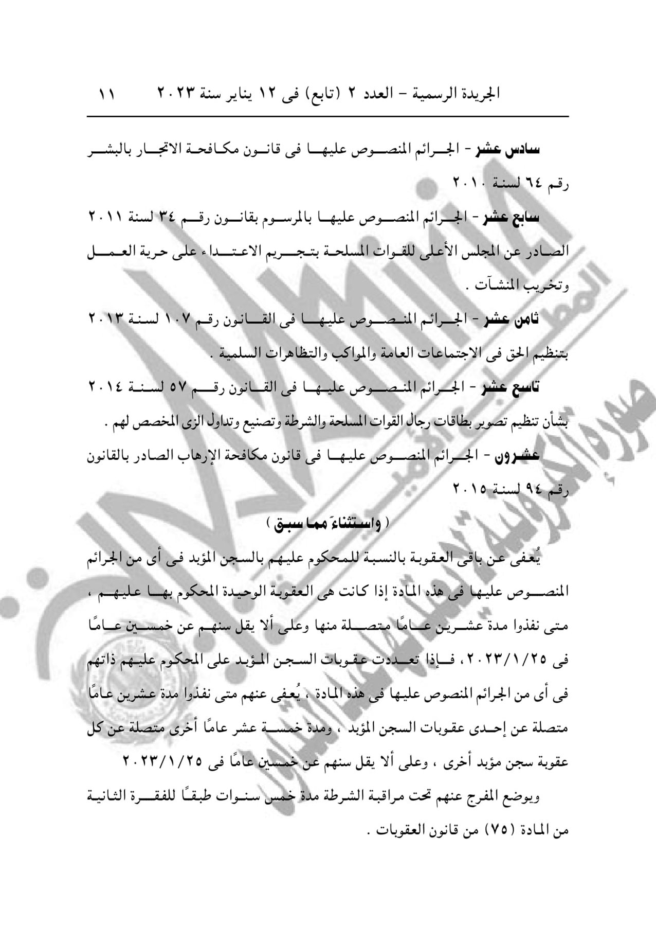 أصدر الرئيس عبد الفتاح السيسى، القرار رقم 7 لسنة 2023 بشأن العفو عن باقي العقوبة لبعض المحكوم عليهم بمناسبة الاحتفال بعيد الشرطة وثورة 25 يناير.
