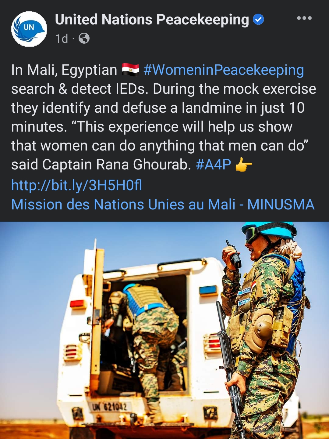 وأضافت الأمم المتحدة، أن الفريق المصري المكون بالكامل من النساء يضطلع ضمن بعثة الأمم المتحدة المتكاملة المتعددة الأبعاد لتحقيق الاستقرار في مالي المعروفة باسم مينوسما، بدور حاسم لإنقاذ الأرواح عبر رصد وإبطال مفعول العبوات الناسفة، وذلك لأول مرة في تاريخ عمليات الأمم المتحدة لحفظ السلام.