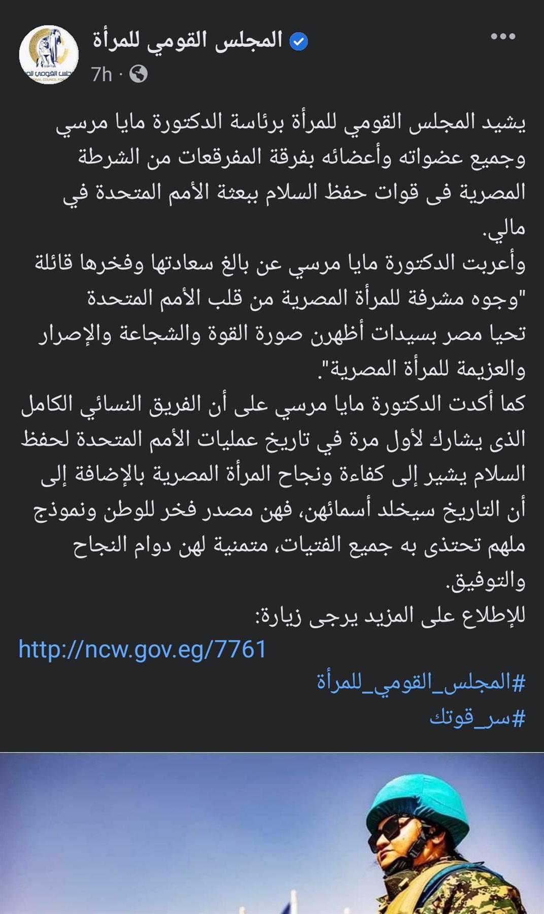 من جانبه، أصدر المجلس القومي للمرأة برئاسة مايا مرسي بيانا أشاد من خلاله بفرقة المفرقعات من الشرطة المصرية فى قوات حفظ السلام ببعثة الأمم المتحدة في مالي.