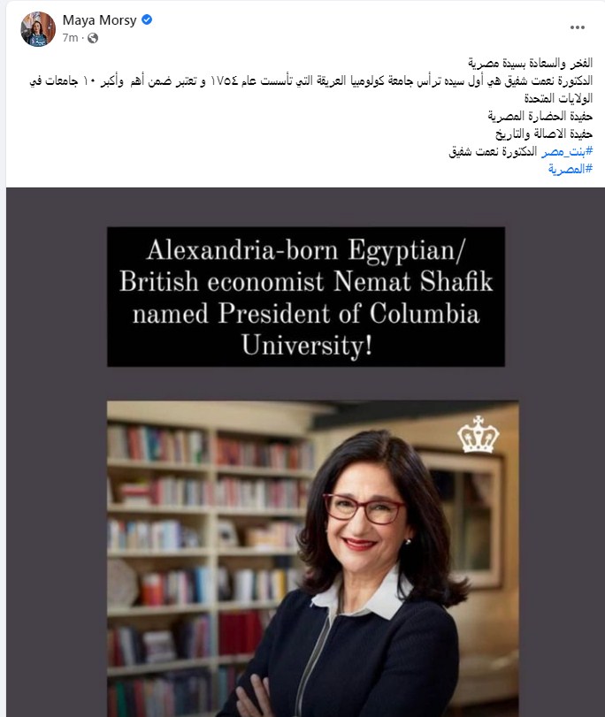 واليوم أصبحت أول سيدة تتولي رئاسة جامعة كولومبيا المرموقة التي تعد من أرقي جامعات العالم، ومن أكثرها حصولًا علي جوائز نوبل. يا ستاتك يا مصر.. تحية من القلب"