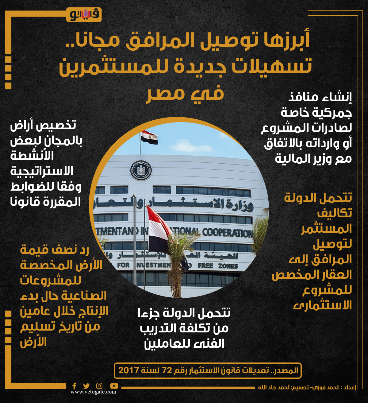 أبرزها توصيل المرافق مجانا.. تسهيلات جديدة للمستثمرين في مصر (إنفوجراف) السبت 21/يناير/2023 - 11:30 ص 1/21/2023 11:30:19 AM تسهيلات جديدة للمستثمرين في مصر، فيتو احمد فوزي شارك طباعة 18 حجم الخط شارك طباعة