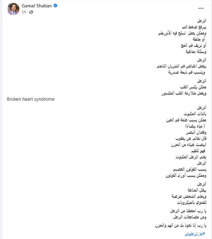 واختتم الدكتور جمال شعبان حديثه عن أمراض الحزن بدعاء قال فيه: "يا رب احفظنا من الزعل ومن مضاعفات الزعل يا رب إنا نعوذ بك من الهم والحزن #ما_تزعلوش".