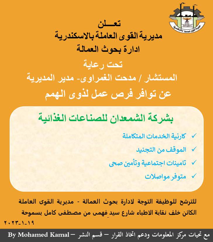 تلقت وزارة القوى العاملة تقريرًا من مديرية القوى العاملة بمحافظة الإسكندرية بشأن توفير فرص عمل لذوى الهمم من أبناء المحافظة في شركة الشمعدان للمواد الغذائية.