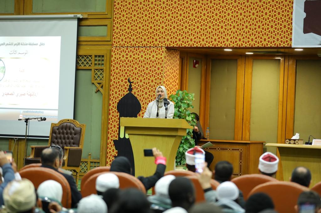 من جانبها قالت الدكتورة نهلة الصعيدي، رئيس مركز تطوير تعليم تطوير الطلاب الوافدين والأجانب بالأزهر، خلال كلمتها في تكريم الفائزين في مسابقة مئذنة الأزهر، إن هذه المسابقة تأتي استكمالا لدور الأزهر الشريف في الدفاع عن اللغة العربية في مواجهة تلك المحاولات الحثيثة للنيل منها، مضيفة أن جوهر المسابقة هو الشعر والحفاظ عليه والحث على فضائله، حيث شجعنا نبينا الكريم على تعلم الشعر والحفاظ عليه وعلى فضائله، مشيرة إلى أن موضوع المسابقة هو مصر، وتم اختياره ولاء لمصر وحبا لها ودفاعا عن مكانتها الكبيرة بين الدول، موجهة الشكر لفضيلة الإمام الأكبر شيخ الأزهر، على اهتمامه بالمسابقة وحرصه على تنفيذها وخروجها على النحو الأكمل، وللجنة التحكيم لمجهودهم الكبير في تحكيم الأعمال بكل نزاهة وحيادية.