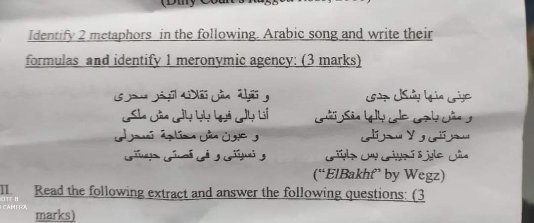 وتضمن سؤال امتحان ألسن عين شمس كلمات الأغنية «عيني منها بشكل جدي وتقيلة مش تقلانة اتبخر سحري، ومش باجي على بالها مفكرتشي، انا بالي فيها بابا بالي مش ملكي، سحرتني ولا سحرتلي وعيون مش محتاجة تسحرلي، مش عايزة تجيبني بس جابتني ونسيتني وفي قصتي حبستني».