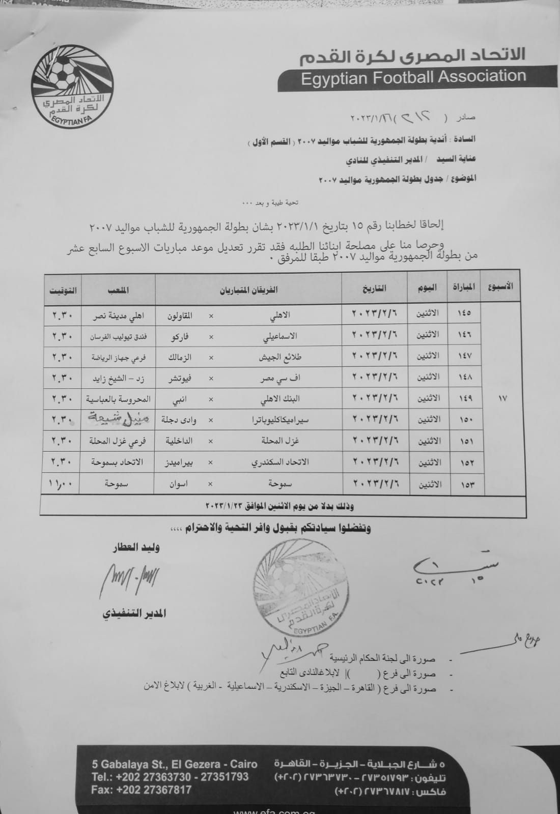 ومن المقرر أن تقام مباريات الأسبوع السابع عشر لدوري الجمهورية للناشئين مواليد 2007 يوم السادس من فبراير المقبل بدلا من 23 يناير الجاري.